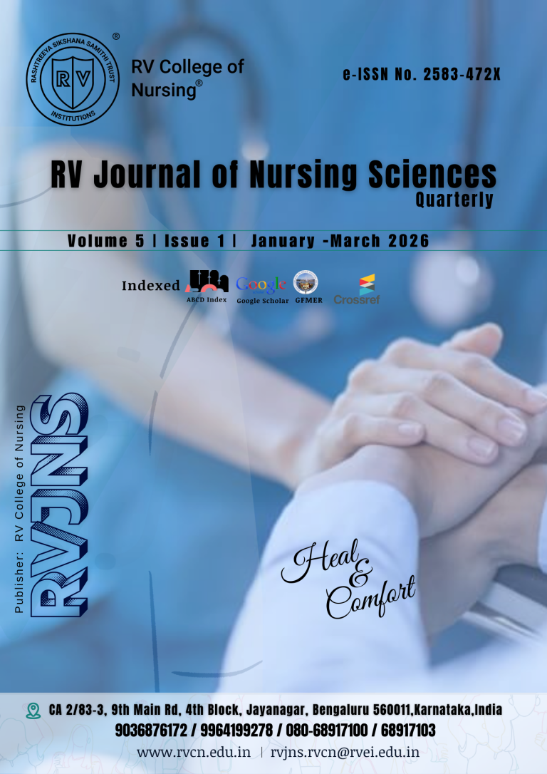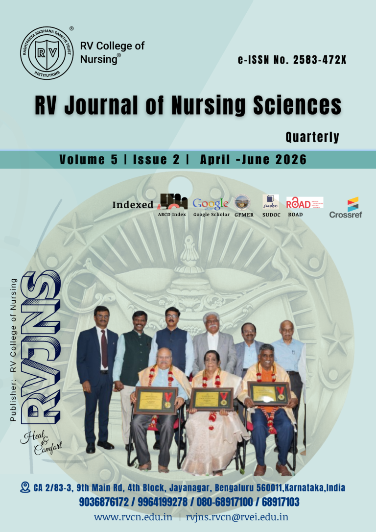 RV Journal of Nursing Sciences (RVJNS) is open access, a peer-reviewed online journal published by the R. V. College of Nursing (RVCN), Bengaluru, India. It is quarterly with editions published in January, April, July and October every year with e-ISSN: 2583-472X. It is a peer-reviewed journal that uses a double-blind review process for evaluation and selection of all submitted materials. RV Journal of Nursing Sciences provides a forum for articles on all aspects of higher degree nursing academics education, research, and management.